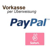 Paypal:Nach Abschluss des Bestellvorgangs werden Sie zu Ihrem Paypal-Account weitergeleitet, um den Zahlungsvorgang dort abzuschließen. Bei höheren Beträgen bzw. beim Überschreiten des Paypal Kreditlimits behält sich Paypal vor, Ihnen eine alternative Zahlungsart zu empfehlen. Aus datenschutzrechtlichen Gründen ist die Bezahlung per Paypal nur bei Online-Bestellung möglich.